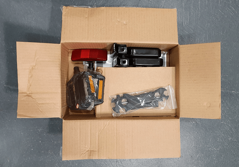 Open the accessories box, which includes the adapter, basic assembly tools, pedals, rear footrests, bike manual and LCD manual. After all protective materials are removed, your bike should look the same as the photo below.